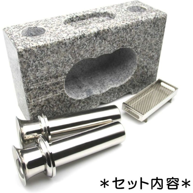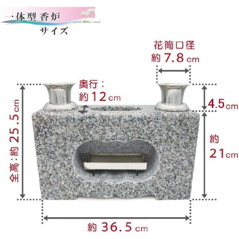 ・花立・線香皿・水鉢が全てセットになった大人気セット これひとつですべて揃ってます。 ・御影石サイズ:(約)幅36.5cm×高さ21cm×奥行12cm ・重さ:約 18 kg ・花立の筒径は4.8cm 取り外し可能でメンテナンスが簡単 ・上部には水受けのくぼみもあります。